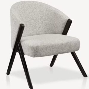 Accent chair with boucle fabric and rubberwood frame.