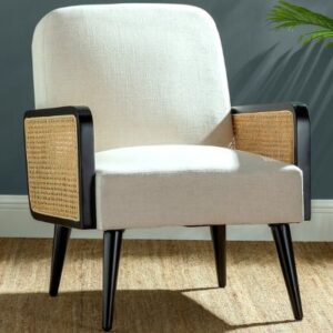 Accent chair with cream fabric, cane accented arms and black wood frame.