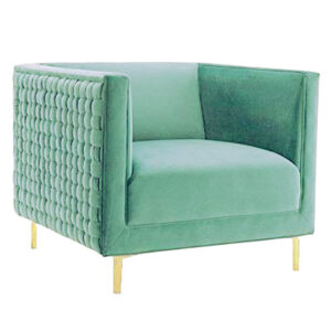 Sea green velvet upholstered chair, with a woven pattern on the arms and the back.Out of stock