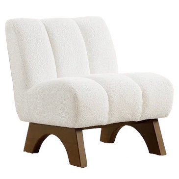 The Howe accent chair has a angled wood frame with curved armrests, and leather- like fabric cushions.