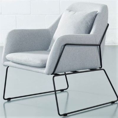 Accent chair with a mid-century design, linen upholstery and black metal frame.