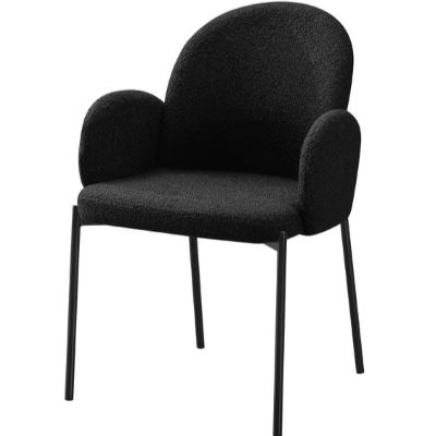 Mid century modern style dining chair upholstered in a gray textured fabric with black metal legs.