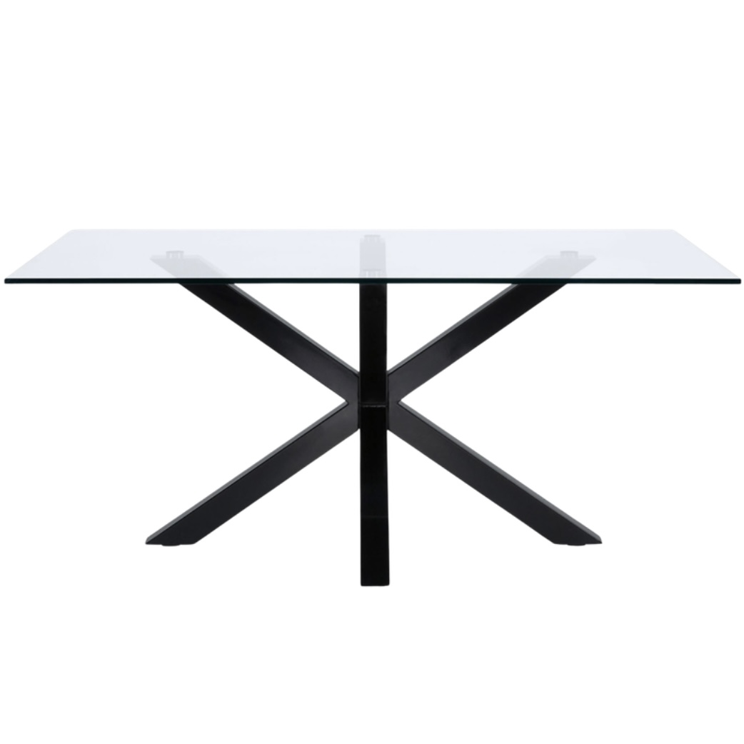 A sleek glass dining table with black metal legs.