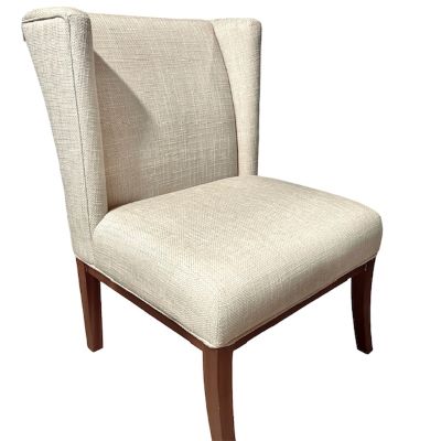 Accent chair upholstered with a beige textured cotton fabric and wooden legs.