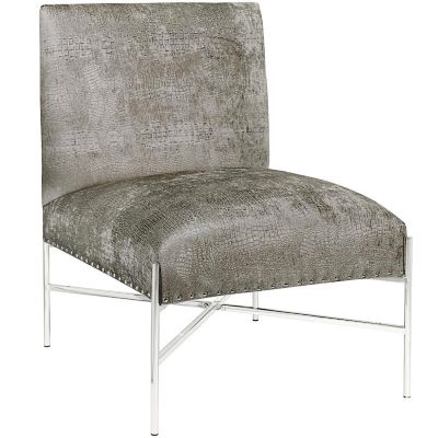 Accent chair upholstered in a creme colored fabric, with chrome back and legs.